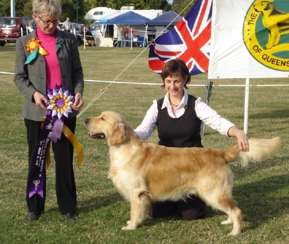 Show Results (Highlights): RDCC and Best Australian Bred in Show at the 2007 Golden Retriever Club of South Australia Championship show. Critique: Of obvious quality this super young mid-gold dog excels in outline, very typey, with a most typical head and gently expression, excellent forehand with corresponding quarters, good spring of rib, correct tail set carrying the right amount of weight, sound driving movement with ample reach in front, at one with handler, Reserve CC. Runner up Best in Show at the 2007 Golden Retriever Club of Queensland Championship Show under Mrs Janet Barow (UK) First - Intermediate Dog Class, the 6th Golden Retriever National Championship Show hosted by the Tasmanian Golden Retriever Club, Hobart under Mrs Mills (UK) Critique