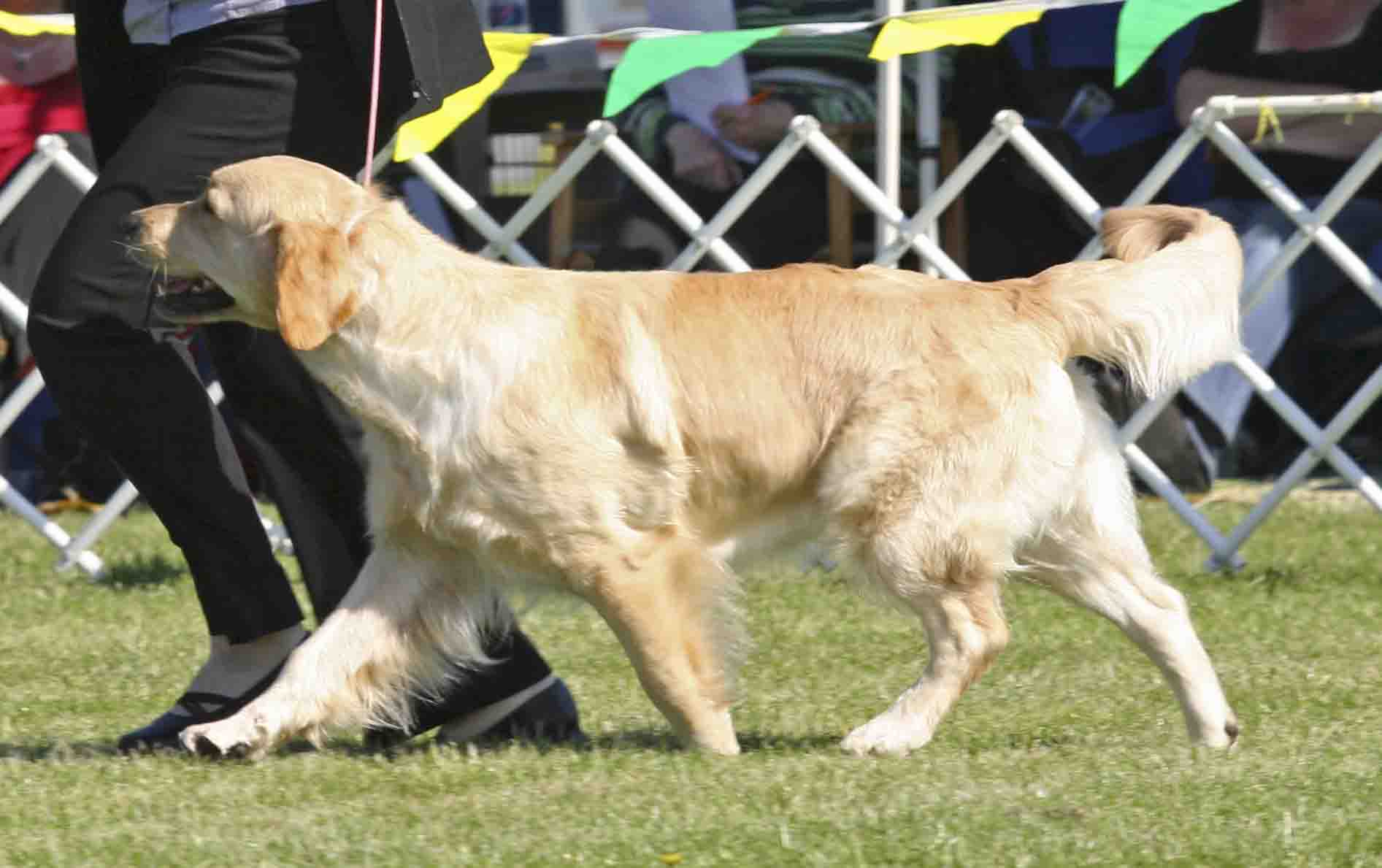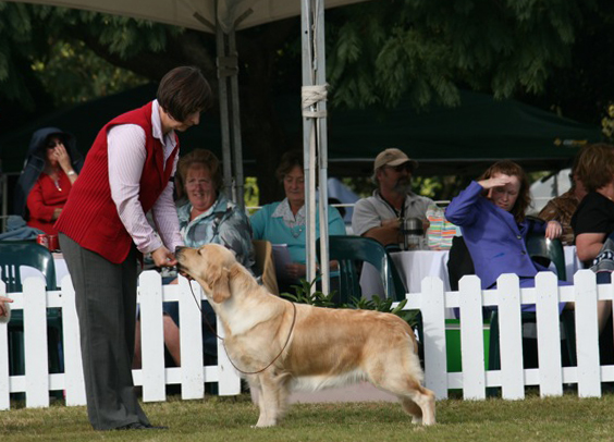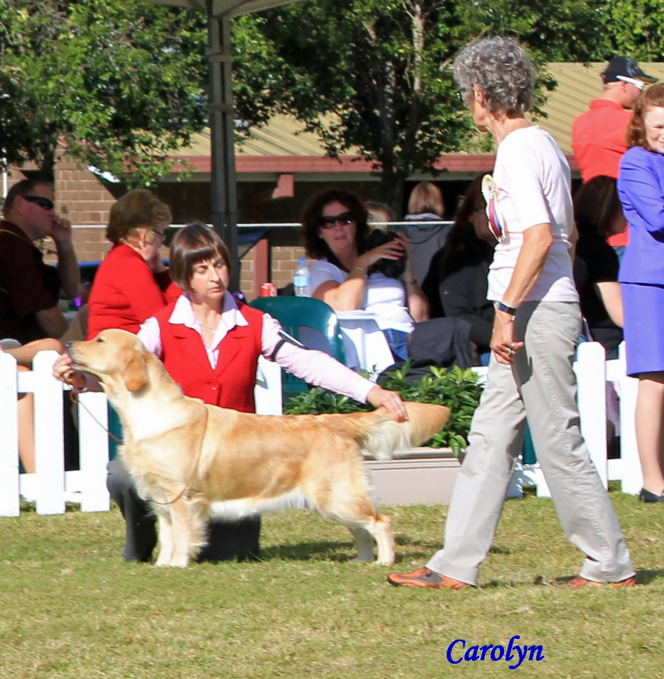Angie at 20 Months winning a large Intermediate Bitch Class at the Victorian Golden Retriever Club Championship Show under Ms Gillian Wicklow (UK) (critique below).
